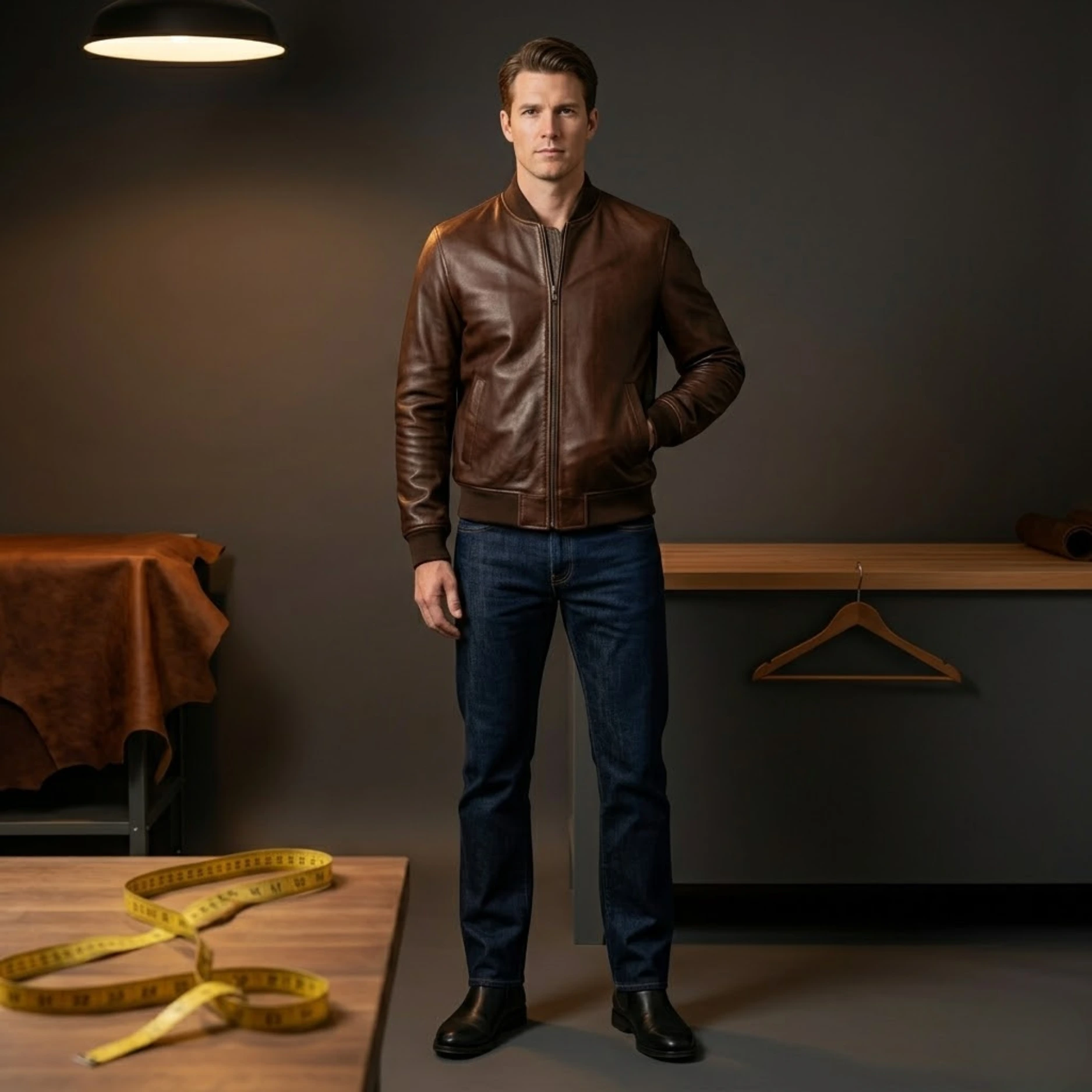 Tall man in a brown leather bomber jacket with straight leg dark denim and Chelsea boots showing the correct full outfit proportion for tall men in leather