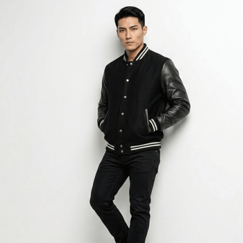 Men’s Black Striped Varsity Jacket | Leather & Wool Hybrid | Snag Leather